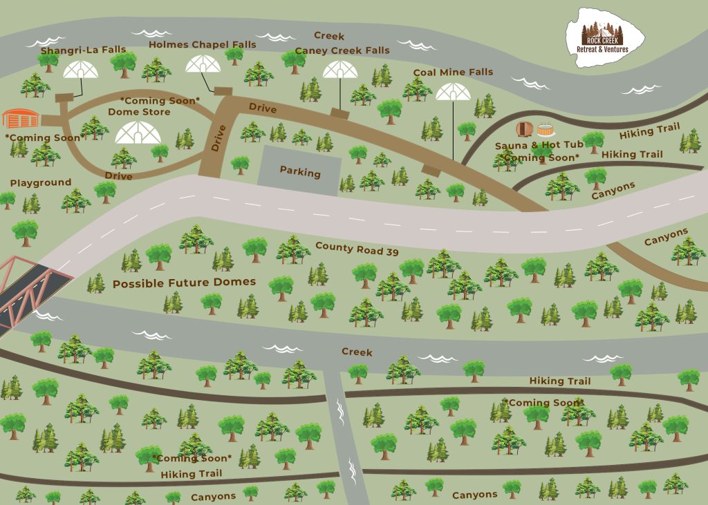 We are located in the small town of Addison, Alabama. We are within a twenty-minute drive from Cullman, Alabama. Smith Lake also known as the cleanest lake in Alabama is approximately 25 minutes from the grounds. Our property is a total of 30 acres with Blevin’s creek that runs through it. We have some wet water waterfalls that are beautiful after a Spring rain. The Bankhead National Forest known for its multiple waterfalls and hiking trails is a 20 minute drive. Many of the waterfalls are about 30 minutes from our property. We have four total 16 ft Geodesic Domes spaced approximately 100 ft apart overlooking our beautiful creek. Each area is a short walk from the drive to your tent. Each tent will have a queen bed and two fold out chair/mats for extra persons. We have 3 hiking trails on our property.